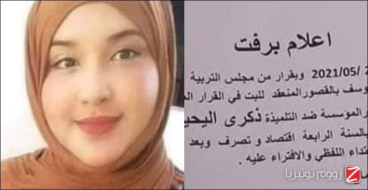 وأضافت، أنه تمّت إحالة التلميذة على أنظار مجلس التربية الذي قرر بتاريخ 25 ماي 2021 رفتها نهائيا من المعهد ، مع اقتراح رفتها من جميع معاهد الجمهورية.