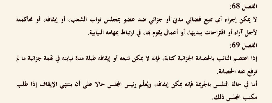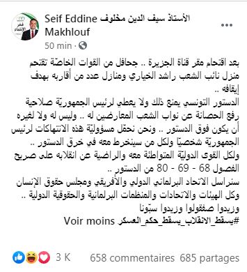 واشار مخلوف إلى أنّ "الدستور التونسي يمنع ذلك ولا يعطي لرئيس الجمهوريّة صلاحية رفع الحصانة عن نواب الشعب المعارضين له .. وليس له ولا لغيره أن يكون فوق الدستور .. ونحن نحمّل مسؤوليّة هذه الانتهاكات لرئيس الجمهوريّة شخصيّا ولكل من سينخرط معه في خرق الدستور .. ولكل القوى الدوليّة المتواطئة معه والراضية عن انقلابه على صريح الفصول 68 - 69 - 80 من الدستور".