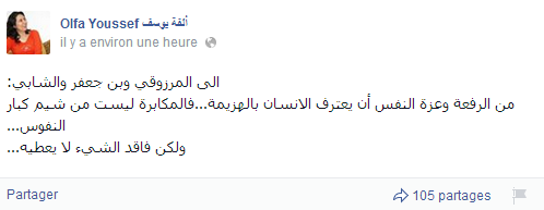 وقالت يوسف، في تدوينة لها على حسابها الشخصي على موقع التواصل الإجتماعي الفايسبوك، أنّ "المكابرة ليست من شيم كبار النفوس، ولكنّ فاقد الشيء لا يعطيه".
