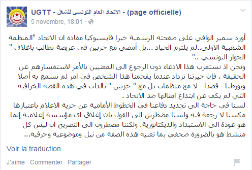 علّق الاتحاد العام التونسي للشغل، عبر صفحته الرسمية على موقع التواصل الإجتماعي فايسبوك، على تدوينة كتبه الإعلامي، سمير الوافي، والتي مفادها أنّ المنظمة الشعبية الأولى لم تلتزم الحياد وأمضت مع حزبين آخرين عريضة تُطالب بإغلاق الحوار التونسي.