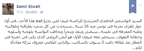 وأكّد الوافي، في تدوينة له على حسابه الخاص على الفايسبوك، أن الحامدي سيتحدّث عن كل شيء بطرافته وتلقائيته وثقته المفرطة في نفسه، سيغني سيغني وينقد ويتجرأ ويخاطب التوانسة بلهجته وأسلوبه وخطابه العفوي.