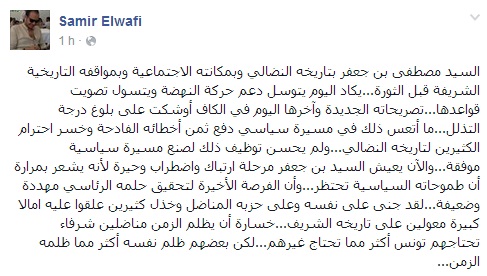 وأضاف الوافي أن بن جعفر يعيش الآن حالة ارتباك واصطراب وحيرة لأنّه يشعر بمرارة أن طموحاته السياسية تحتظر وأن الفرصة الأخيرة لتحقيق حلمه الرئاسي مهددة وضعيفة، وفق قوله، "رغم حاجة تونس لمثل هذه الكفاءات التي ظلمهت نفسها أكثر مما ظلمها الزمن".