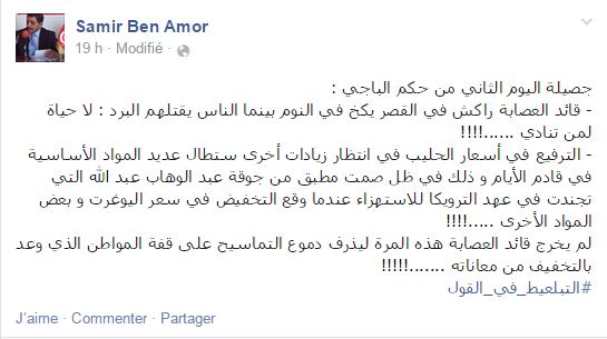 وقال بن عمر، في تدوينة له على الفايسبوك، أنّه تم الترفيع في أسعار الحليب ولم يُقدم اي مساعدة للمترضيين من موجة البرد الي تعيشها البلاد.