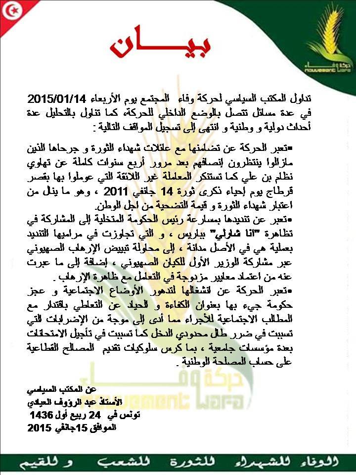 حيث عبرت حركة وفاء عن تضامنها مع عائلات شهداء و جرحى الثورة الذين مازالوا ينتظرون إنصافهم بعد مرور أربع سنوات كاملة عن تهاوي نظام بن علي كما تستنكر المعاملة غيراللائقة التي عوملوا بها في قصر قرطاج يوم إحياء ذكرى 14 جانفي 2011 وهو ماينال من إعتبار شهداء الثورة وقيمة التضحية من أجل الوطن حسب نص البيان .