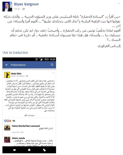تجدر الإشارة أنّ الأستاذة الجامعية نايلة السليني كانت قد ردّت على وزير الشؤون الدينية محمد خليل عبر تدوينة فايسبوكية ذيّلتها بما يلي "آه نسيت: حذار يا كاهن الدين راني بنت الزاوية البكرية ندق اللي يتحكحك عليّ".
