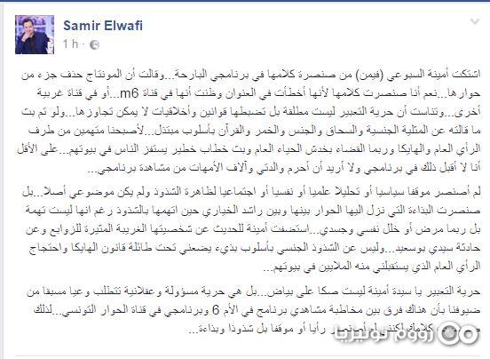 وأشار سمير الوافي إلى أنّه لو تم بث ما قالته عن المثلية الجنسية والسحاق والجنس والخمر والقرآن بأسلوب مبتذل لأصبح متهم من طرف الرأي العام والهايكا وربما القضاء بخدش الحياء العام وبث خطاب خطير يستفز الناس في بيوتهم، موضحاً أنّه لا يقبل ذلك في برنامجه ولا يُريد أن يحرم والدته وآلاف الأمهات من مشاهدة البرنامج.
