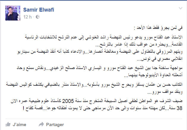وكشف سمير الوافي أنّ نائب رئيس مجلس الشعب ونائب رئيس حركة النهضة، عبد الفتاح مورو، اِتهم الرئيس الأسبق المنصف المرزوقي بالتطاول على النهضة ومغالطة أنصارها، والادعاء كذبا أنّه أنقذ النهضة من سيناريو انقلابي مصري في تونس، وفق نص التدوينة.