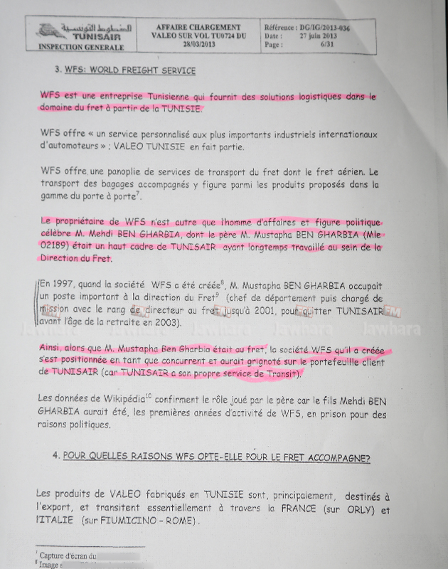 واضاف أنه انطلاقا من تقارير للتفقدية العامة فإن الوزير الحالي طلب من كوادر الخطوط التونسية لتمرير خدمات شحن بطريقة غير قانونية لأمتعة وسلع تابعة لشركة بن غربية التي تتمتع أيضا بأولوية مطلقة لدى الناقل الوطني وبشكل غير قانوني من خلال استغلال النفوذ أساسا. كما أكد أن التحقيق القضائي يتعلّق حاليا بالضرر الذي الحقته مثل هذه المعاملات المشبوهة بالناقل الجوي الوطني، كاشفا عن عدد القضية التي تثبت تورط مهدي بن غربية.
