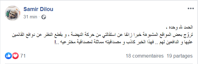 نشر القيادي في حركة النهضة، سمير ديلو، اليوم الثلاثاء 16 جويلية 2019، تدوينة عبر صفحته على موقع التواصل الاجتماعي " فايسبوك" يكذّب من خلالها خبر استقالته من الحركة .
