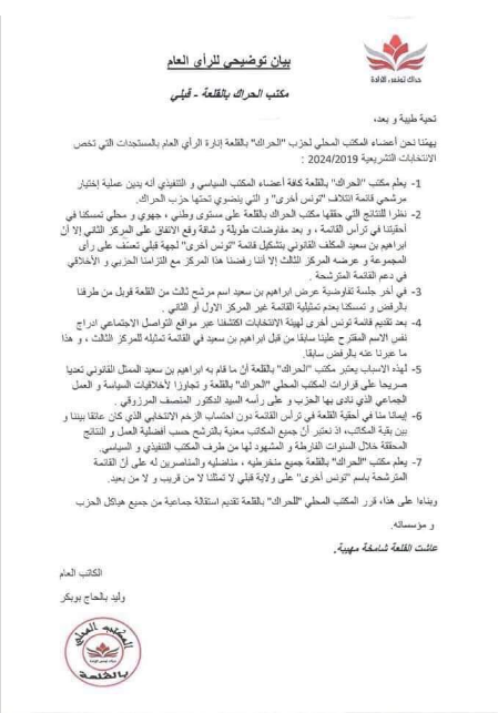 ووفق البيان الذي أصدره مكتب الحراك بالقلعة، فإنّ الاستقالة جاءت على خلفية اختيار مرشّحي قائمة "تونس أخرى" التي ينضوي تحتها حزب الحراك.