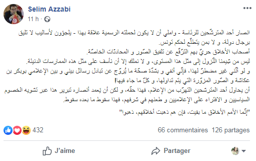 واعتبر العزابي في تدوينة نشرها عبر صفحته على الفيسبوك أن ما يقوم بها مناصرو أحد المرشحين للرئاسة من "تشويه الخصوم السياسيين والافتراء على الإعلاميين وطعنهم في شرفهم"، هو "سقوط ما بعده سقوط"، وهي "أساليب لا تليق برجال دولة، و لا بمن يتطلّع لحكم تونس"، حسب تعبيره.