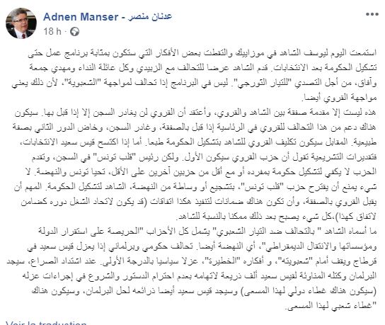 من جهته تحدّث عدنان منصر أيضا في تدوينة مطولة على حسابه على فايسبوك، عن "صفقة" بين يوسف الشاهد و المترشح للرئاسيات نبيل القروي، الذي لن يخرج من السجن إلا إذا قبل بها، على حدّ قوله.