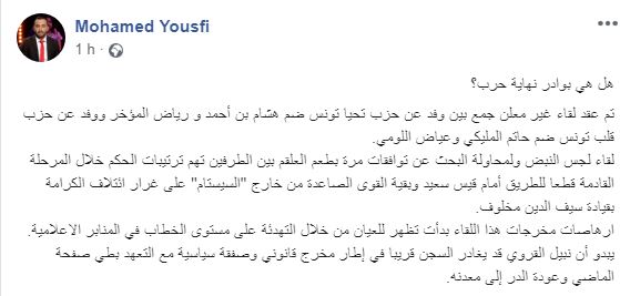 وقال اليوسفي في تدوينة على حسابه على فايسبوك، أنّ اللقاء بين الطرفين جاء لمحاولة البحث عن توافقات لقطع الطريق أمام قيس سعيد وبقية القوى الصاعدة من خارج "السيستام".