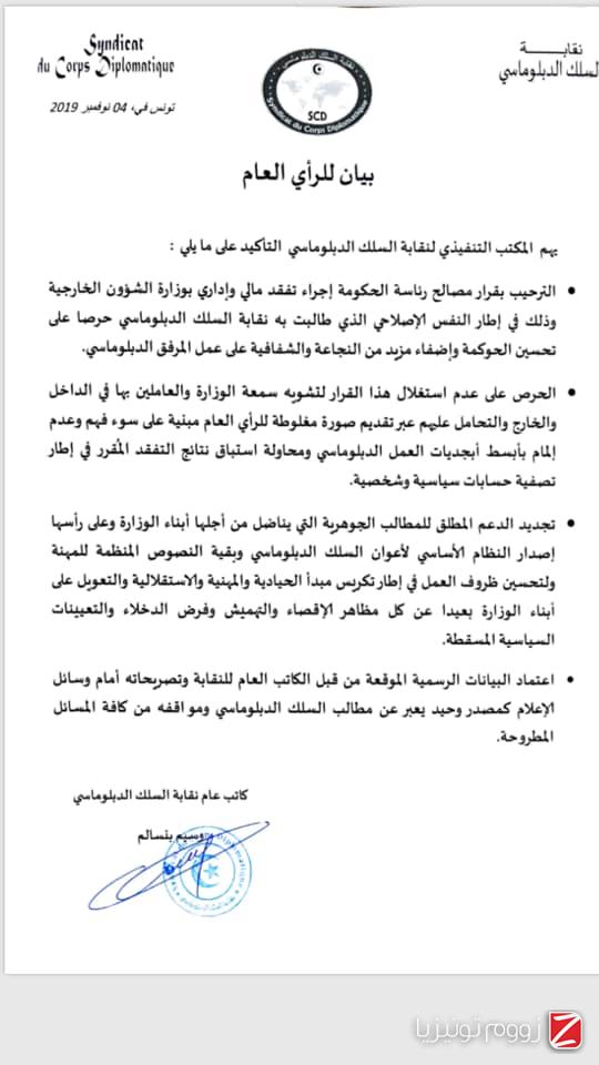 ووفق بلاغ النقابة، فقد شدّدت حرصها على عدم استغلال قرار مصالح رئاسة الحكومة، بإجراء تفقد مالي وإداري بوزارة الشؤون الخارجية، لتشويه سمعة الوزارة، كما حثّت على الحرص أيضا على "عدم التحامل على العاملين بالوزارة، في الداخل والخارج، عبر تقديم صورة مغلوطة إلى الرأي العام، مبنية على سوء فهم وعدم إلمام بأبسط أبجديات العمل الدبلوماسي".