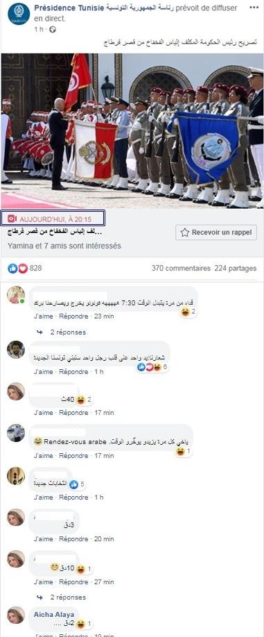 وأعلنت رئاسة الجمهورية، عبر صفحتها الرسميّة على "الفايسبوك"، عن تصريح للفخفاخ على الساعة السابعة مساءً، إلاّ أنّ التصريح تأجّل ثلاث مرّات لحدّ الآن.