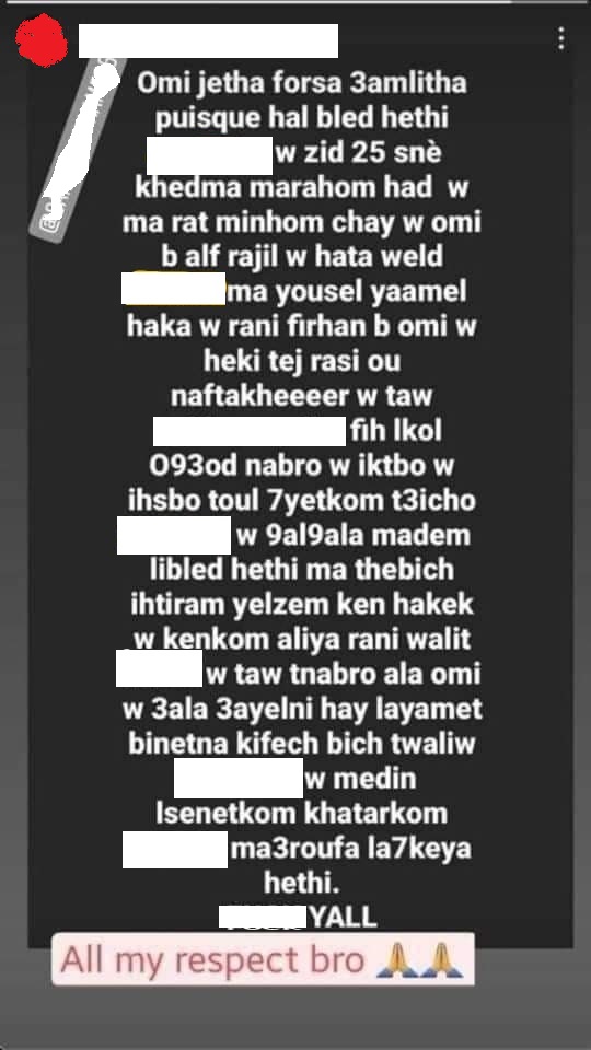 وأكّد الشاب، عبر حسابة على موقع "انستغرام"، أنّه فخور بوالدته كثيرا، مبيّنا أنّها تعبت مدة 25 سنة في عملها ولم تجد المُقابل.