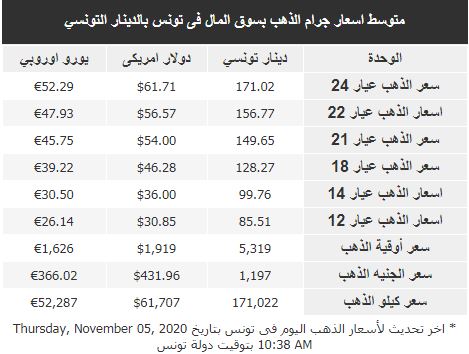 من جهتها، شهدت أسعار الذهب في تونس اليوم الخميس 5 نوفمبر 2020، ارتفاعا مقارنة بأسعار أمس ليسجل عيار 22 مبلغ 156.77 دينار وعيار 24 مبلغ 171.02 دينار.