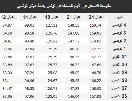 وفي مايلي متوسط أسعار الذهب اليوم بأسواق المال في تونس بالدينار التونسي :